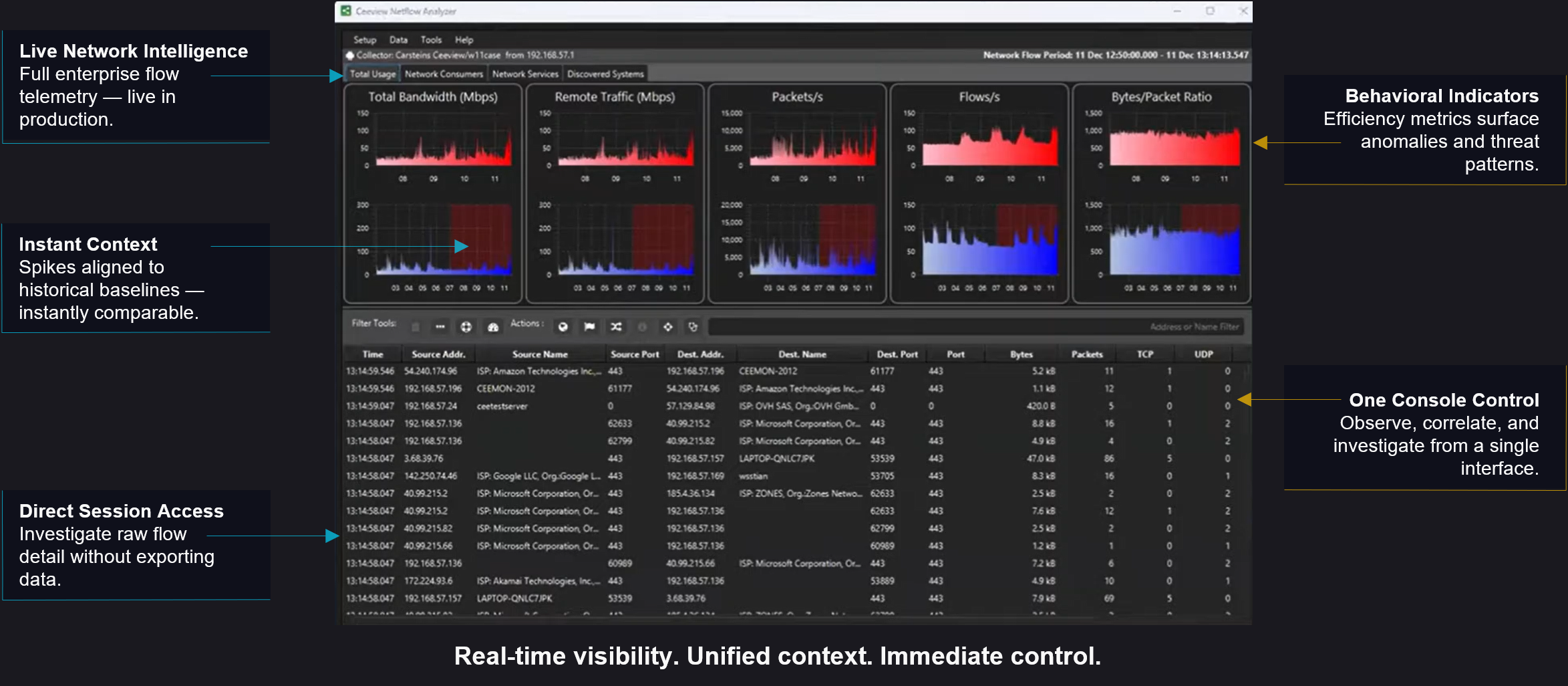 Ceeview’s Total Usage Console provides an immediate view of live enterprise flow telemetry — revealing bandwidth utilization, packet activity, flow rates, and traffic composition across the environment. Time-based charts highlight sudden changes in traffic behavior, helping operators quickly recognize unusual activity.