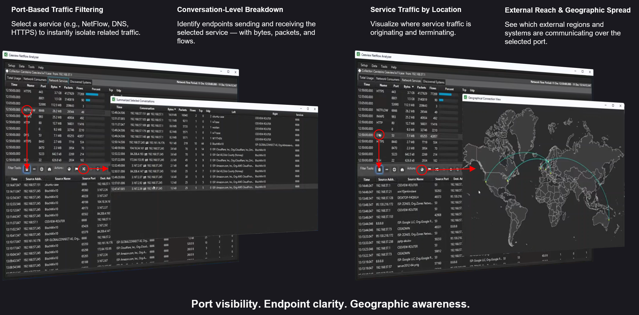 By combining port-level filtering, endpoint visibility, and geographic traffic insight in a single workflow, Ceeview enables investigators to rapidly understand how critical services are being used across the network.