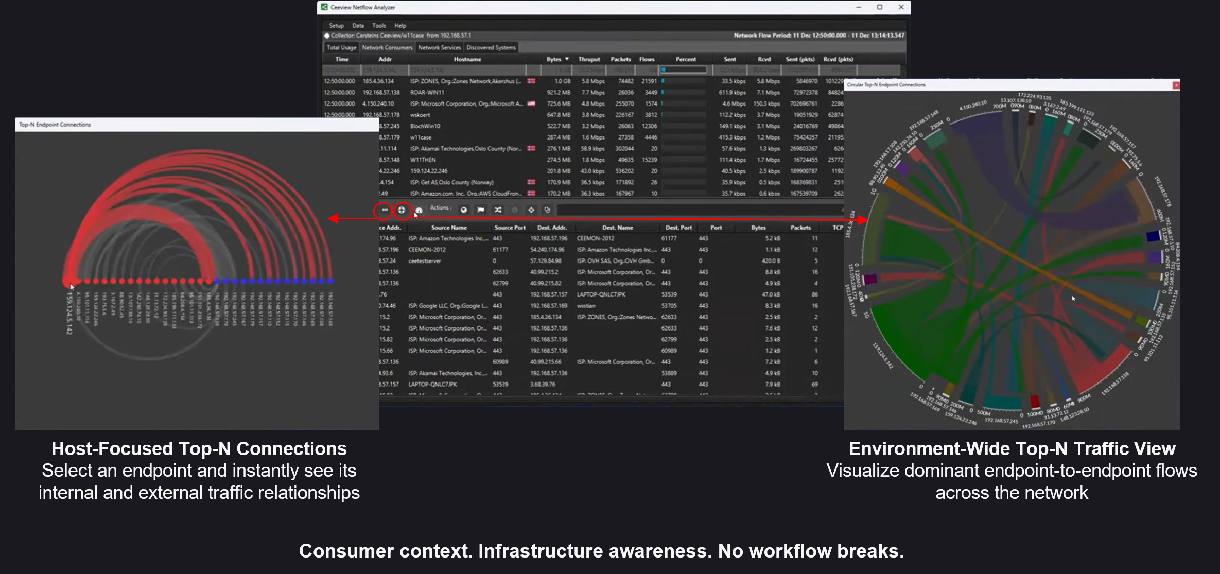 Ceeview NetFlow Analyzer transforms raw flow data into contextual intelligence — giving teams immediate visibility into traffic relationships, anomalies, and dominant network consumers directly within a single operational console.