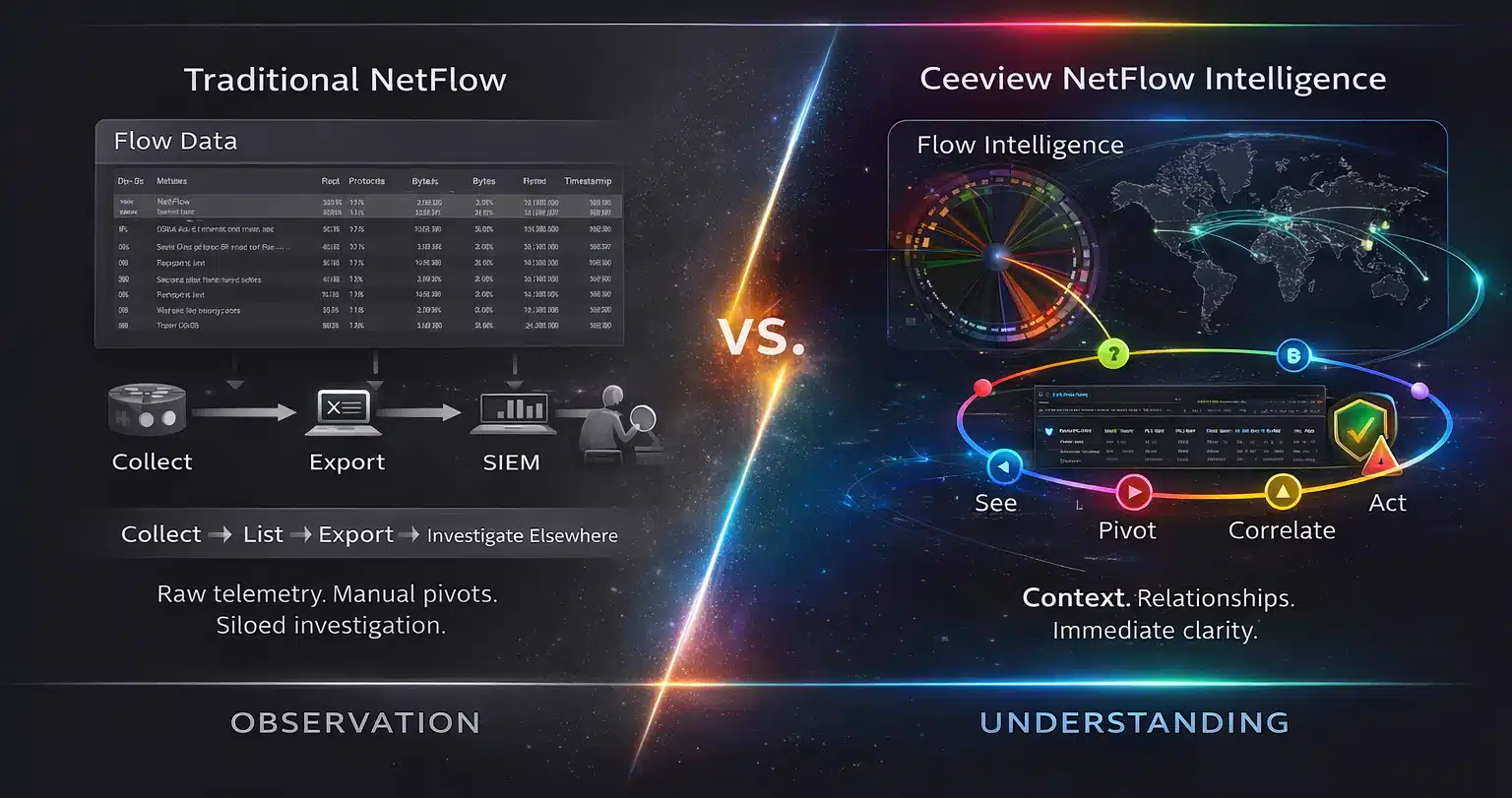 Ceeview processes network flow telemetry through the NetFlow Intelligence Engine, transforming raw records into contextual insight.